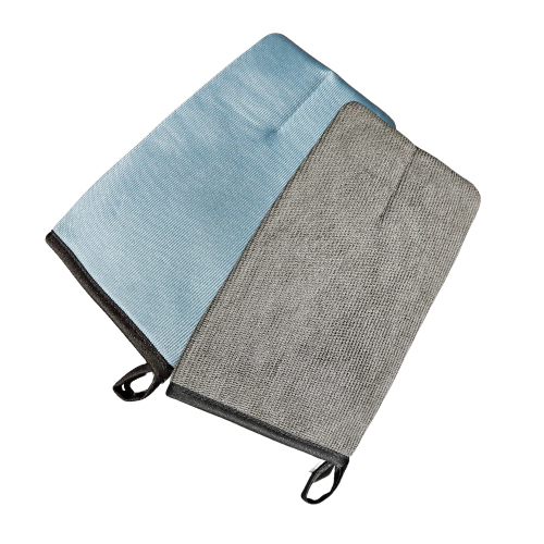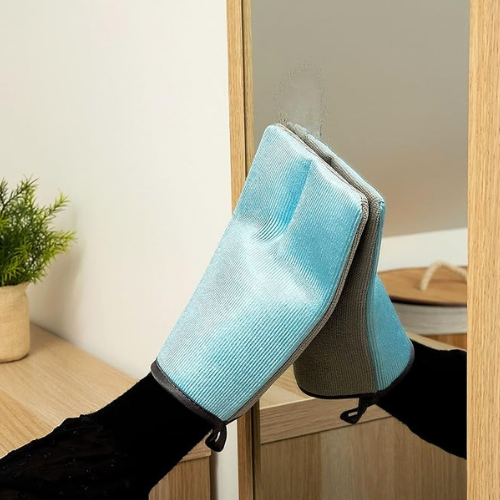 Gant microfibre Vitres & miroirs : possède deux faces spécifiques, 1 face grise « tissage perles » pour désincruster vos surfaces lisses et vitrées et 1 face bleue « tissage circulaire ligné » pour les sécher, sans rayer. Il s'utilise avec votre produit détergent « vitres » habituel mais il est aussi très efficace sans produit, grâce à l'action mécanique des microfibres qui fait l'efficacité de ce produit. Résultat sans trace !